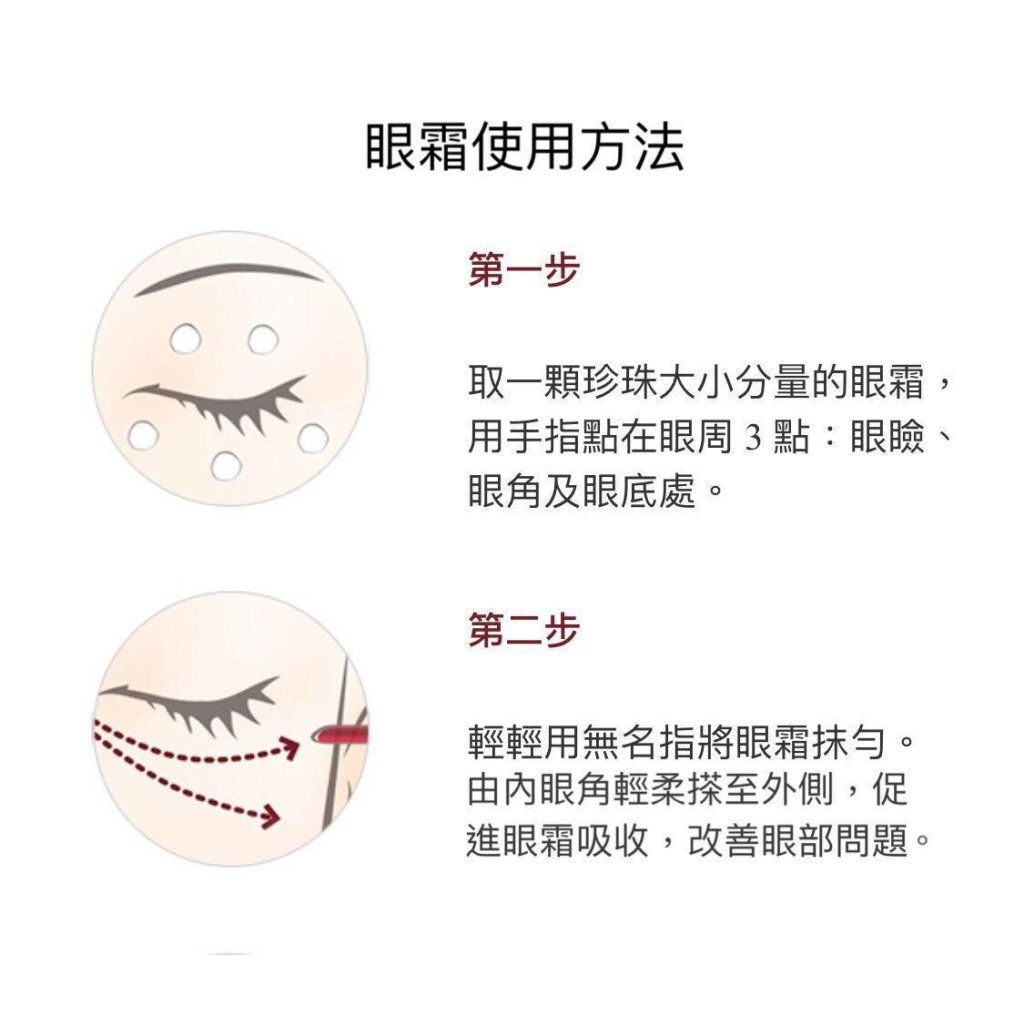 取一顆珍珠大小分量的眼霜,用手指點在眼周3點:眼瞼丶眼角及眼底處